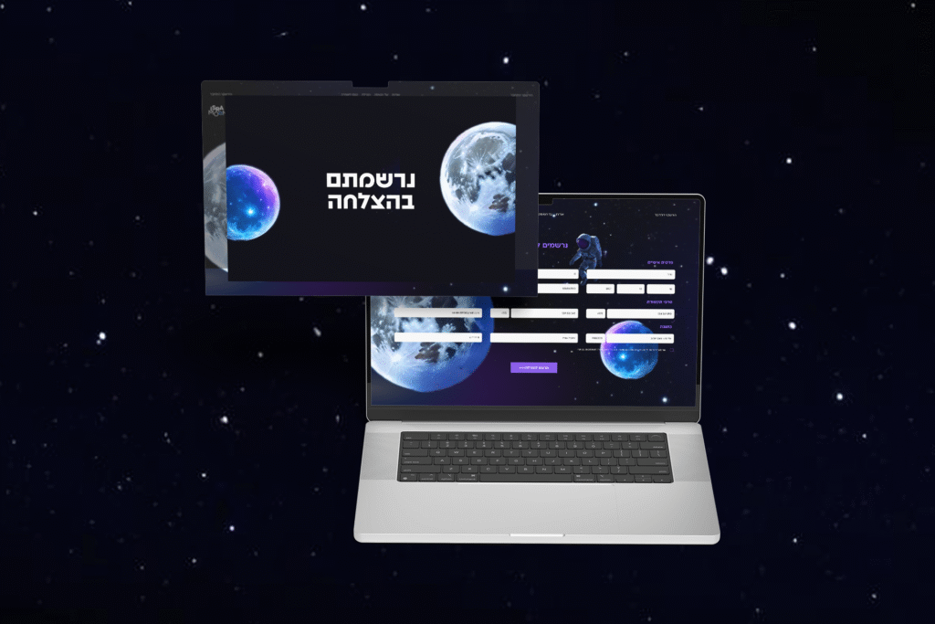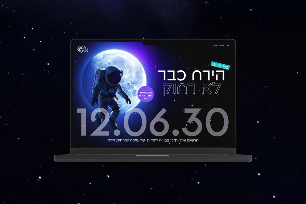 בהמשך לשפה העיצובית של הכרזה, עוצב דף נחיתה שמרחיב את חוויית המותג ומשמש כשער ראשוני לקמפיין. דף הנחיתה שומר על פלטת הצבעים, האווירה והאייקונים המרכזיים, ומציג את הקריאה לפעולה: "מתקדמים לעבר הירח". כפתור זה מוביל את המשתמש לעמוד ההרשמה, כשהעיצוב נשען על היררכיה ברורה, טיפוגרפיה חדה ומרחבים נקיים שמאפשרים למסרים לבלוט.